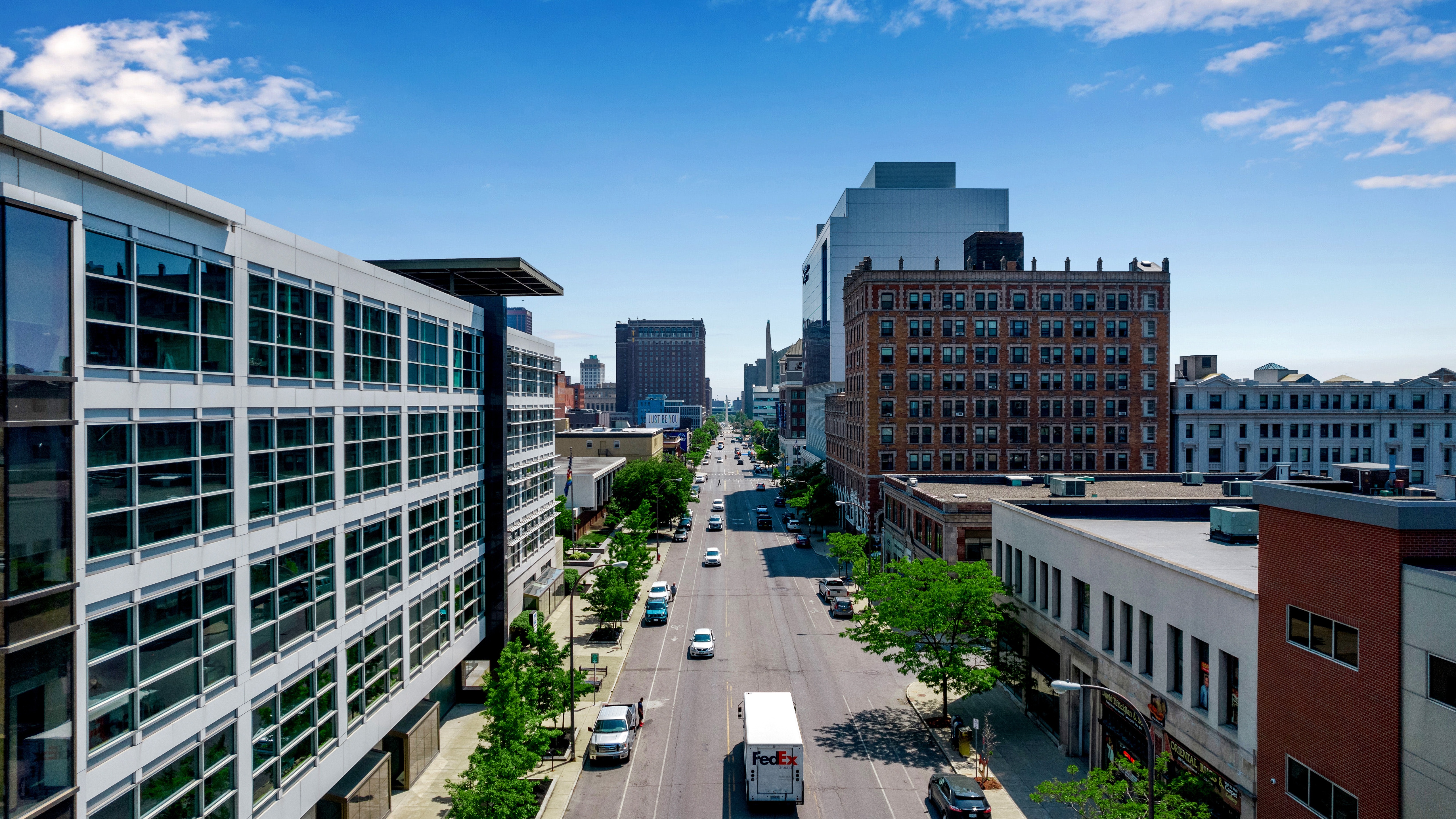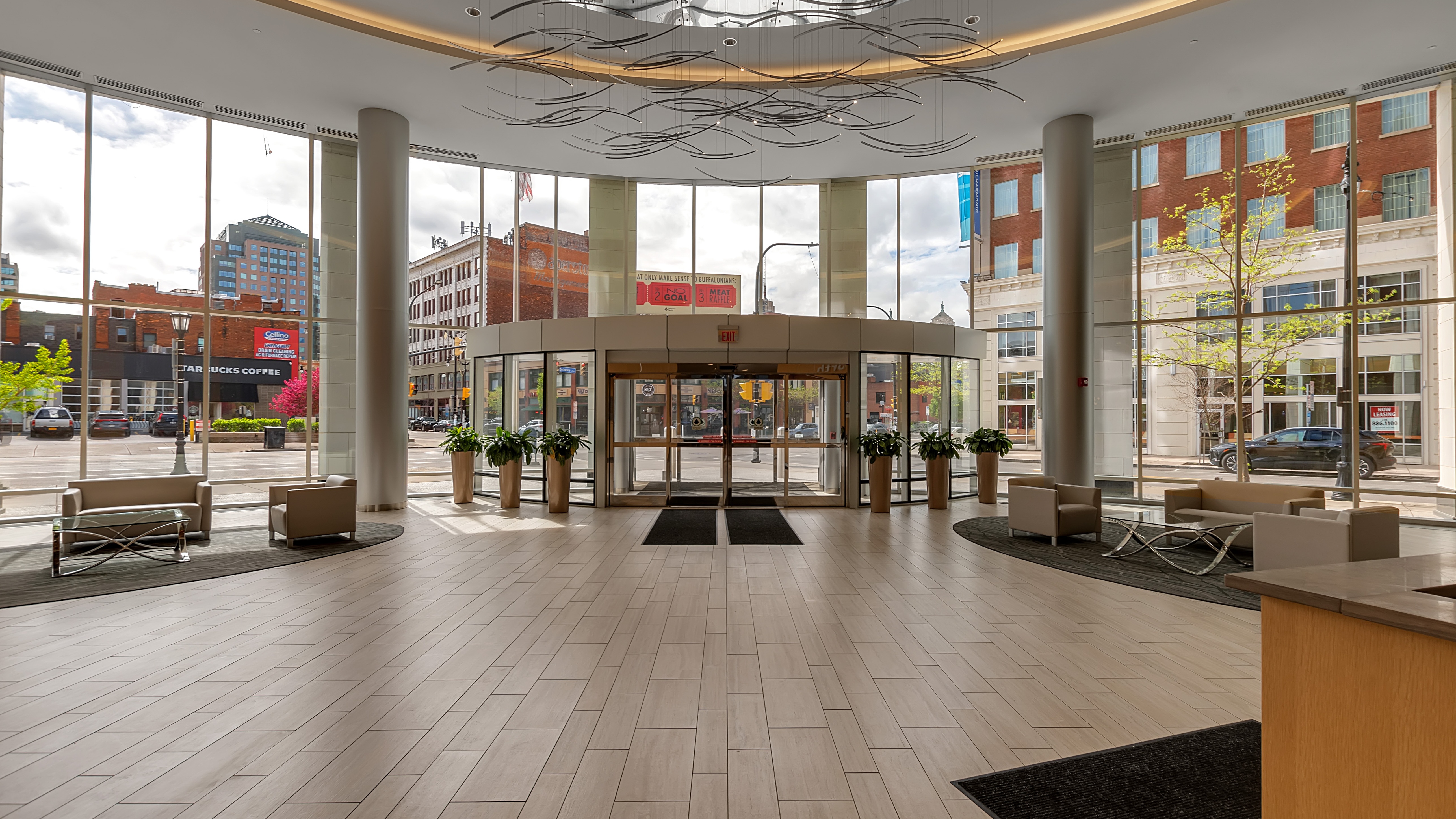 The striking elegance of the curved 12-story glass-walled exterior provides captivating views of the city and Lake Erie. The unique elliptical entry rounds a key city corner and the reconstructed terra cotta facade pays homage to the site’s architectural history.