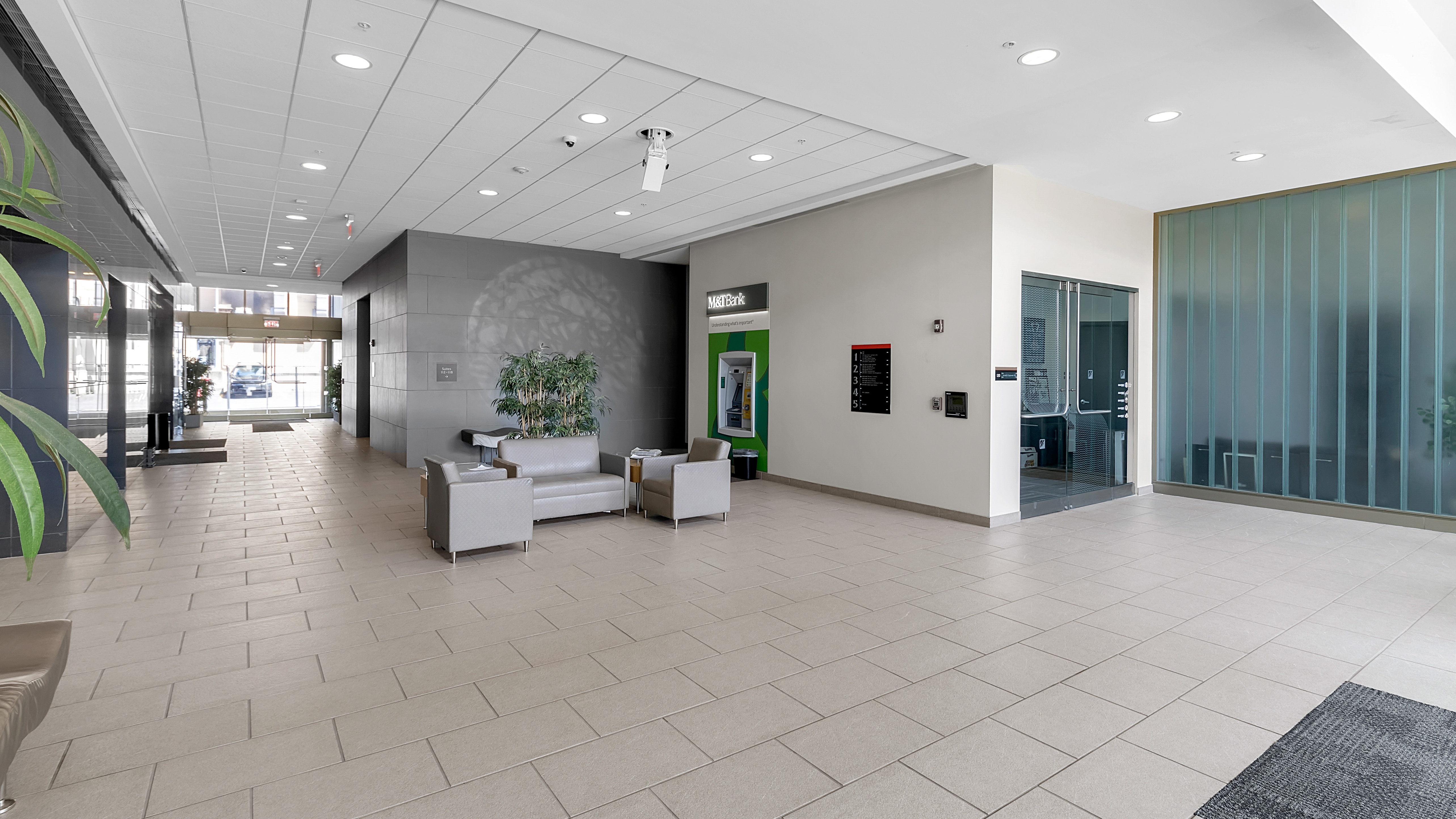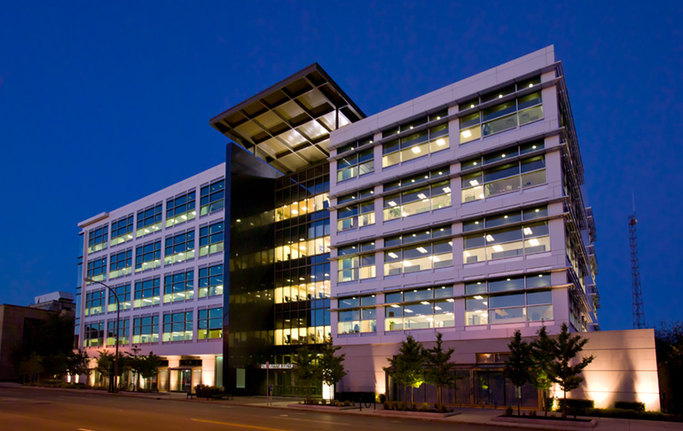 The urban building is placed at the sidewalk. The entrance/elevator lobby is transparent to be highly visible from the street and the rear parking area. The ground plane of the lobby extends through and outside of the building on both the sidewalk and parking sides, to create a pronounced threshold entrance experience. The envelope is composed of metal panels, glass, and limestone. The ground floor wall along the street is stone, with projecting storefront bays. The bisecting, 80′ tall, wall marking the entrance is polished black porcelain tile, which allows the adjacent glass curtain wall and entrance materials to reflect on the surface. High performance glass and sun screens are used to retain the transparency, while increasing the functional performance.
