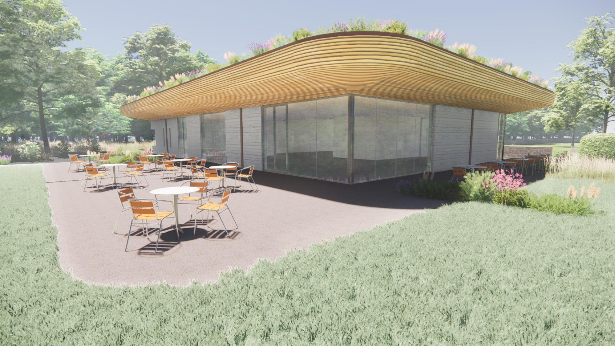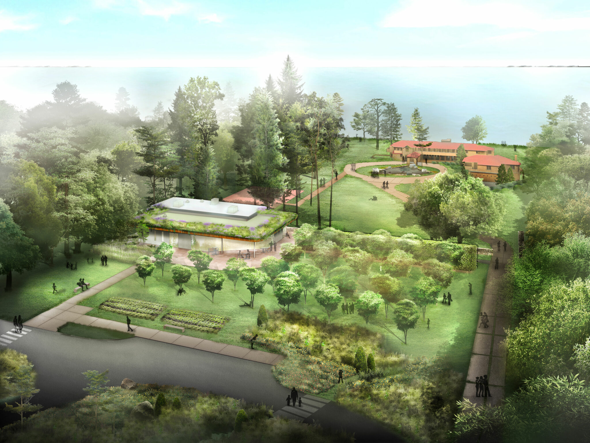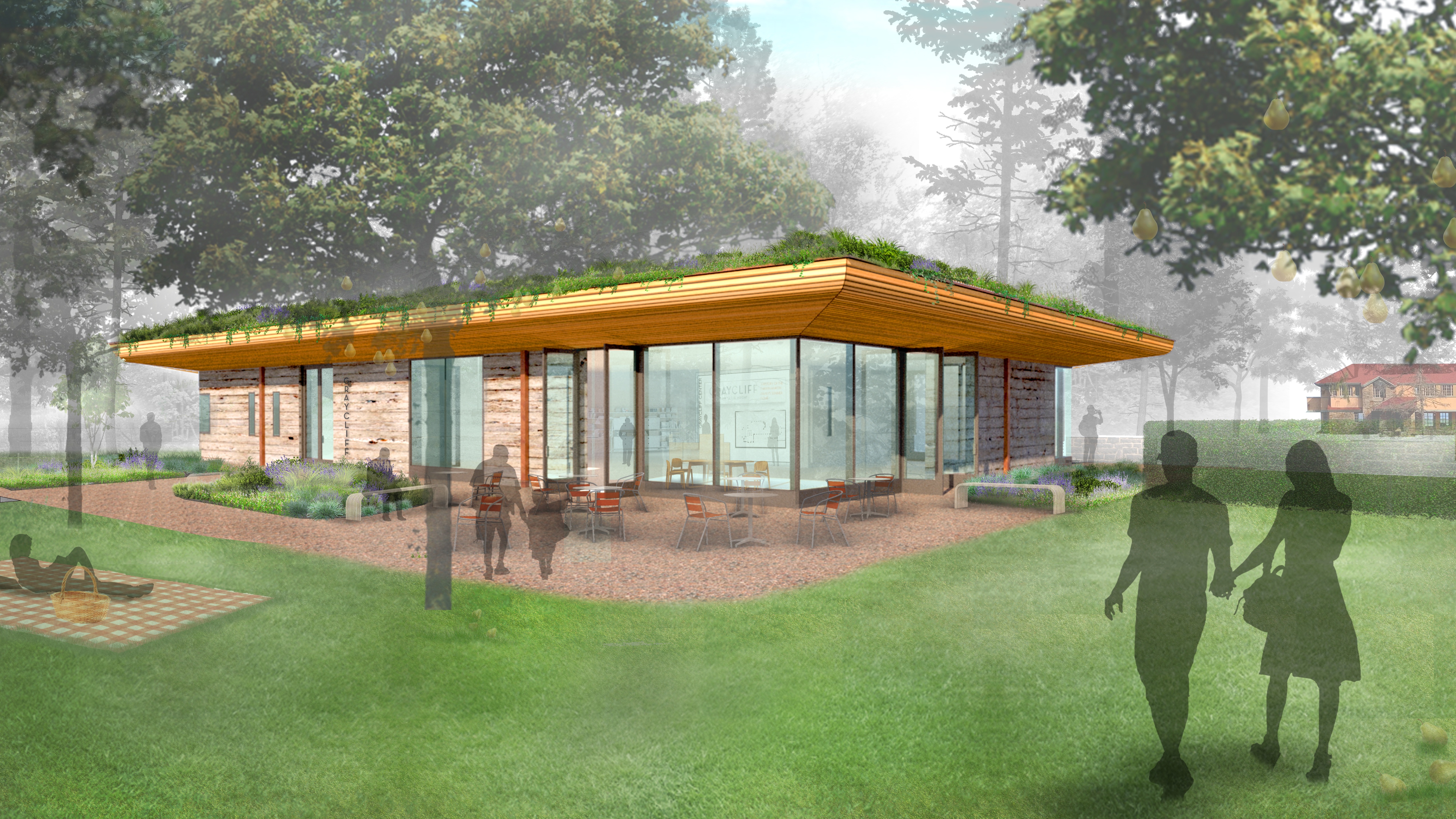 The building is topped by an intensive green roof that cantilevers outward toward a restored fruit orchard creating an outdoor covered porch area. Clad in natural wood, this prominent roof feature seeks to bring the outside in and ensconce the new center within the existing landscape.
